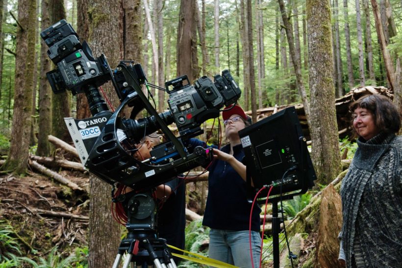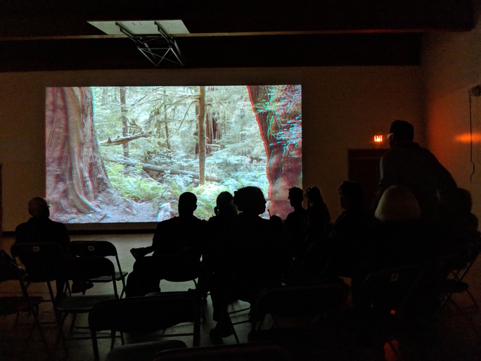 The public then joined the group for a screening of Forest Breath held at the Port Renfrew Elementary School on August 12. Leila’s Forest Breath is a 3D stereoscopic video installation filmed with an IMAX rig with two Sony F65 8k cameras in the south Walbran. Thanks to a special installation with Leila’s technical director Jorge Zavagno, audiences were able to “walk through” the forest as the 3D effect became a layered extension to the gym’s space.